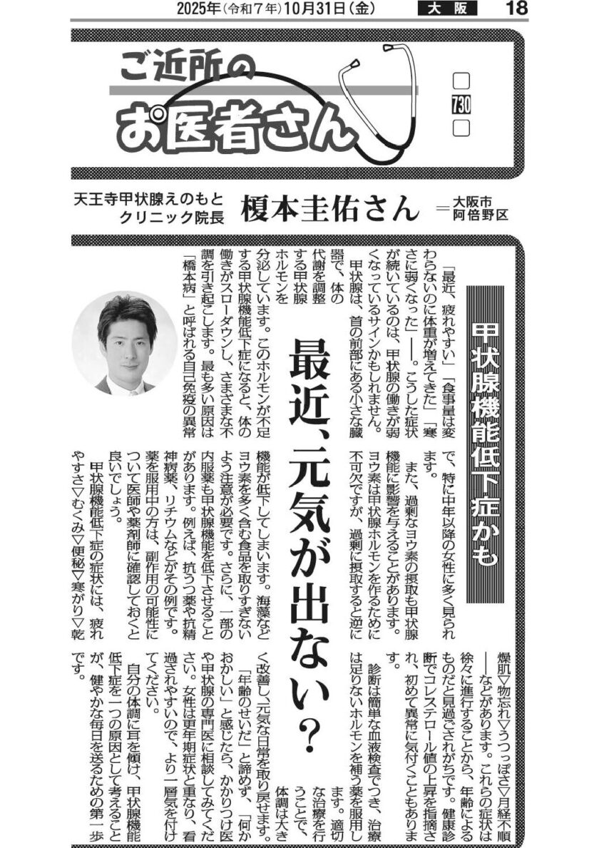 毎日新聞 2025年10月31日 ご近所のお医者さんコーナー(朝刊コラム)に当院院長の記事が掲載されました。